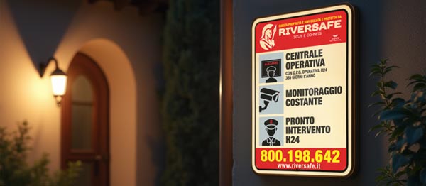 Ma sulla recinzione, bene in vista, un cartello Riversafe avverte che la proprietà è protetta da un sistema di sicurezza avanzato.